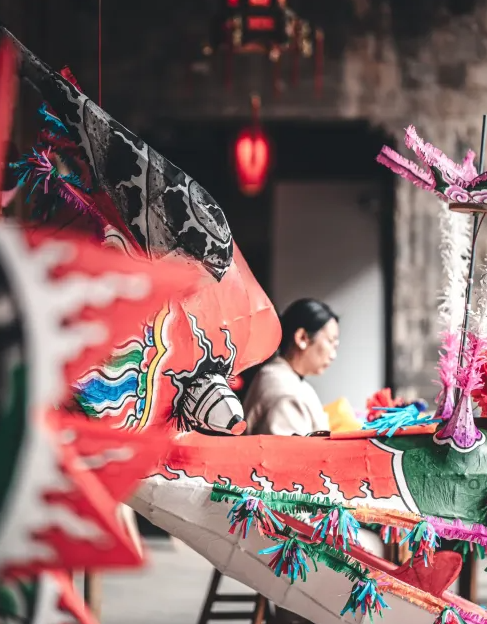 Each bench serves as the skeletal frame of the dragon. Holes are drilled at both ends and joined with wooden rods or iron rings, enabling the dragon’s body to twist and sway with remarkable flexibility. The decorations are meticulous and vibrant: the dragon’s head is crafted with bamboo strips, adorned with colorful paper and silk, its eyes wide and spirited, whiskers flying high — vividly lifelike. The body is dressed with hand-painted scales, gold foil, or painted clouds, sparkling in the sunlight. The tail is often styled like a fish’s tail, symbolizing the auspicious legend of the carp leaping over the dragon gate