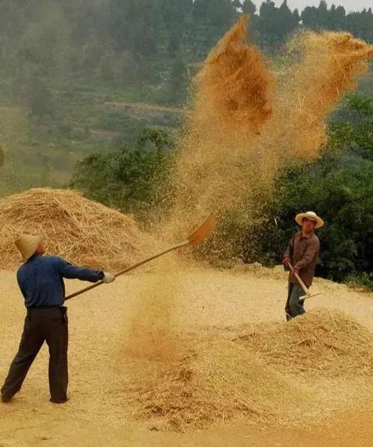 Once the straw stacks were piled, the threshing ground looked clear—just stacks of grain remained. At that point, the grain was full of chaff, bits of soil clods, husks, and broken straw. Clearing those was laborious. During the day, the grains spread to dry, and every hour or two, someone had to turn them so the lower layers also received sunlight. In evenings, we’d gather the grain into mounds again to shield against dew or sudden nighttime rain. Gathering also helped when clearing impurities. This job was called “yang chang” (raising the grains)—using wooden shovels to toss the grains into the air, letting the breeze blow away husks and stray chaff.